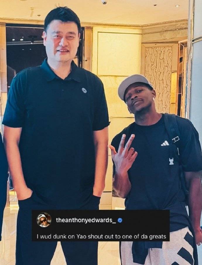北京时间2025年8月26日,安东尼-爱德华兹近日与姚明合影。